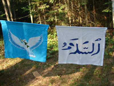 The banner has "Peace" written in many languages. Arabic, Chinese, English, Sanskrit, Russian, Hebrew and Latin along with a rainbow colored Peace Sign and the Dove of Peace.